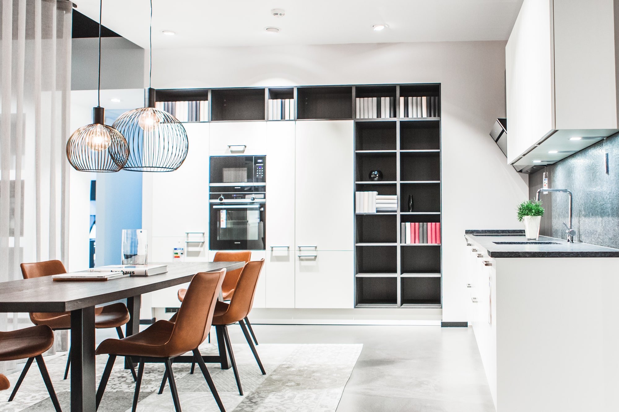 • Große Ausstellung mit vielfältigen Musterküchen und Materialmustern.