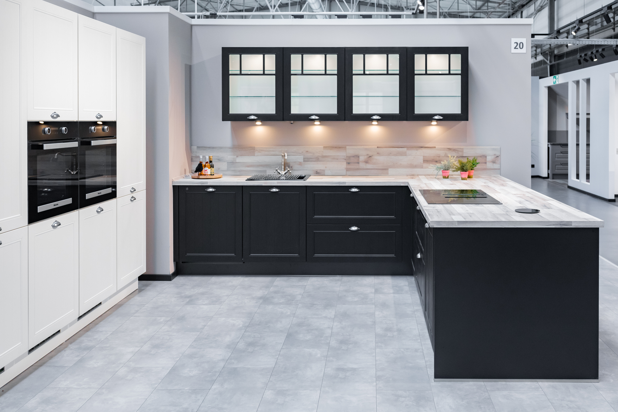 Weiße Küche mit heller Arbeitsplatte und schwarzen Akzenten - Dassbach Küchen Haan