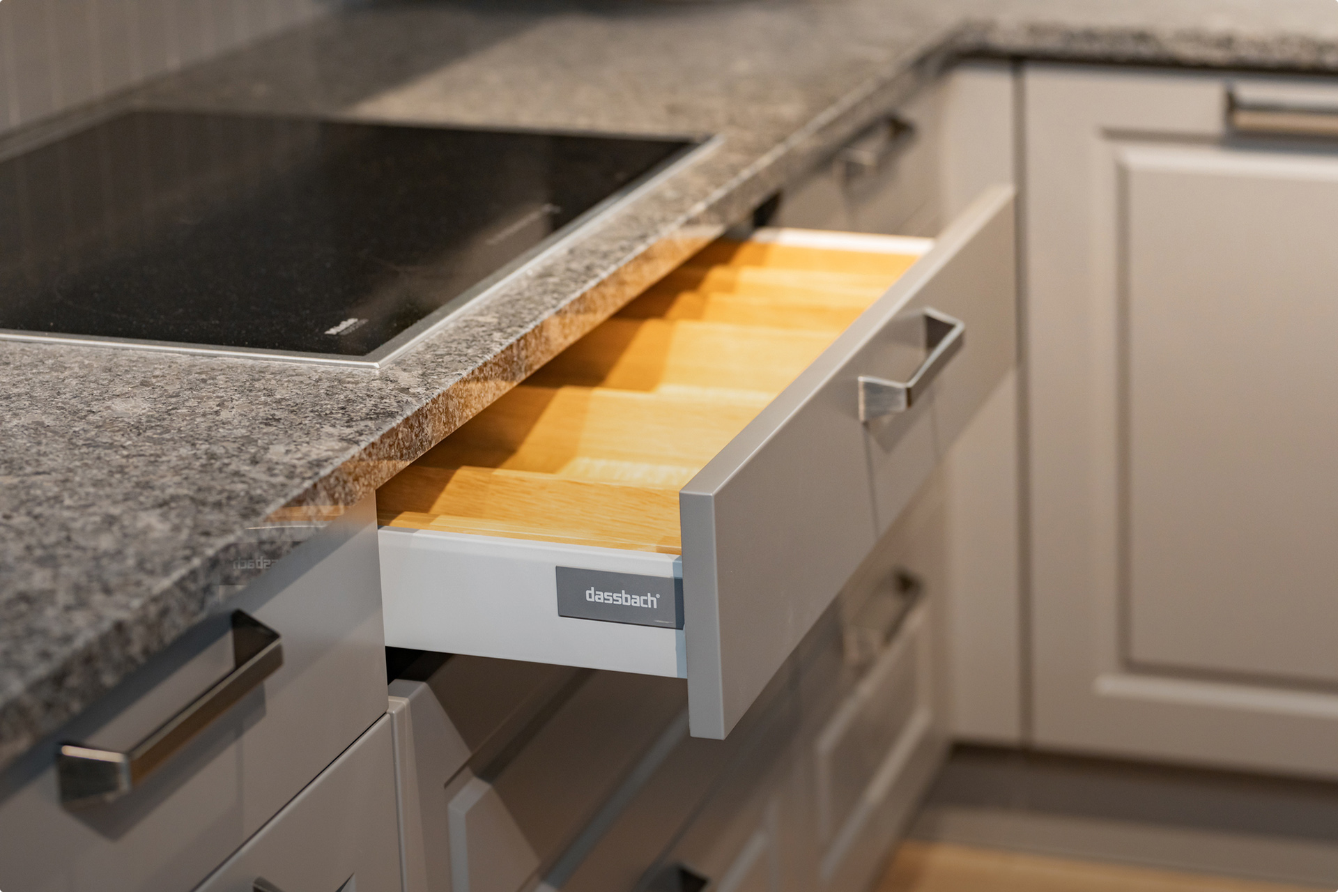 Nie wieder langes Suchen: Hochwertige Schubladensysteme bringen Klarheit in jeden Handgriff. Mit durchdachten Einsätzen für Besteck, Kochutensilien, Gewürze oder sogar Messer schaffen Sie Ordnung da, wo Sie sie am dringendsten brauchen – direkt unter der Arbeitsfläche. Vollauszüge, Soft-Close-Technik und individuell einteilbare Fächer machen die Nutzung besonders komfortabel. Auch für tiefe Schubladen bieten unsere Systeme Lösungen, bei denen nichts verrutscht. So haben Sie beim Kochen stets alles griffbereit, sparen Zeit und erhöhen die Freude am Zubereiten. Unsere Ordnungssysteme lassen sich perfekt an Ihre Bedürfnisse anpassen – ob minimalistisch oder umfangreich ausgestattet.